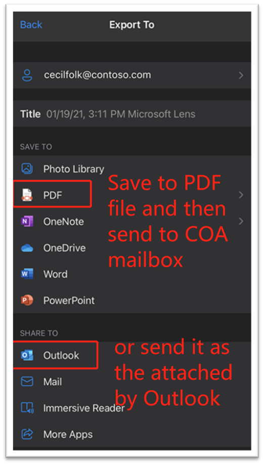 - Scan the document by MS Lens or MS Office Mobile App and share to COA processing mailbox