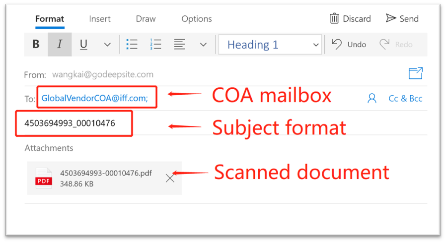 After scanning, users can send the image version or PDF version of scanned copy to the mailbox GlobalVendorCOA@iff.com. Please make sure you have read the Email Limitation and Requirements in section 5 Appendix of this User Guide before sending the mail and write PO#, IPC# clearly in the subject of the email.