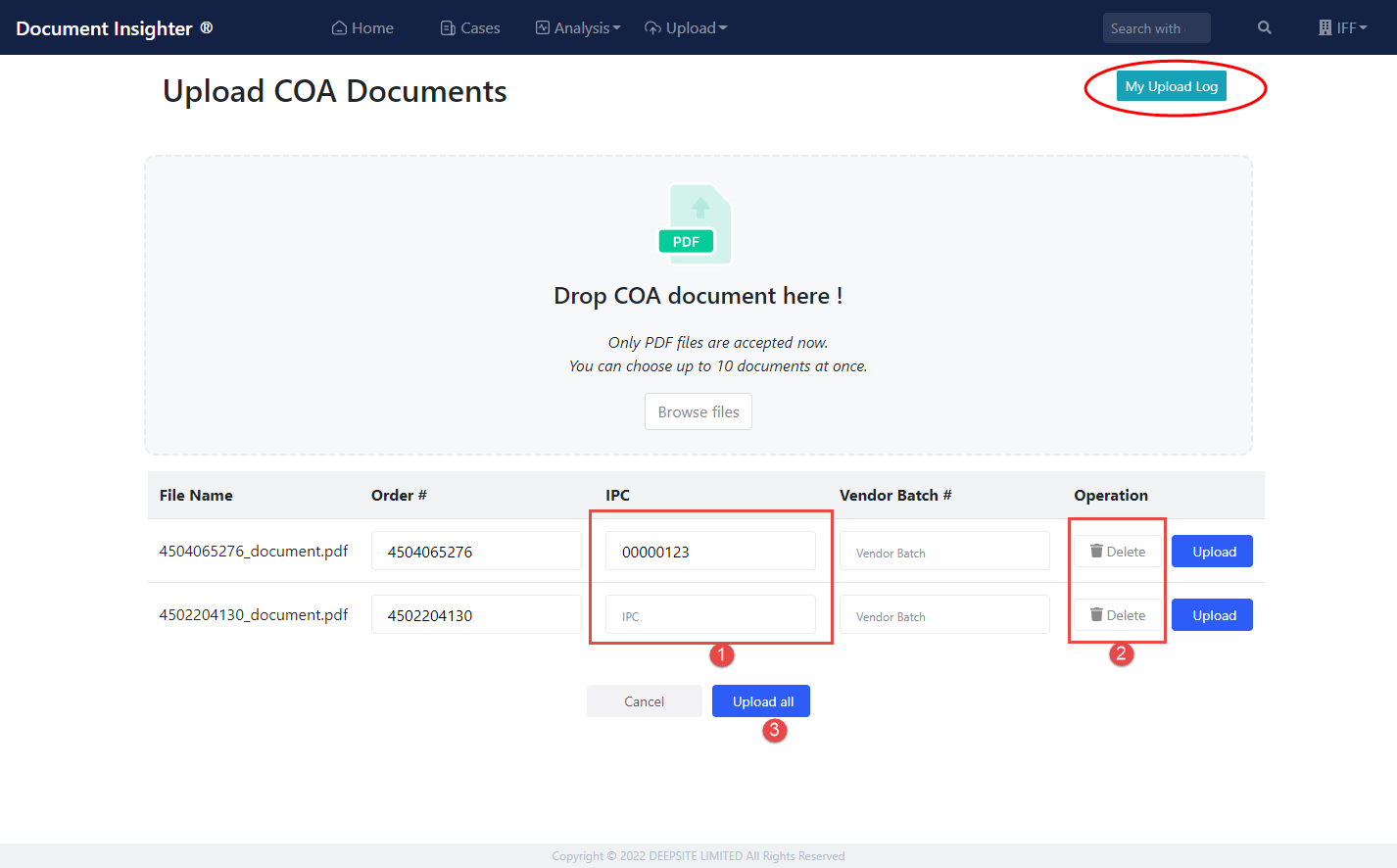 Users can drag or choose the PDF file to upload the document, ① The system will try to extract the PO# and IPC from the title of the file automatically if the title format is “PO#_IPC ”, for example 4500001234_00001234. ② Users can also delete the files from the uploading list. ③ Once the list is ready, click the “Upload” button to complete the uploading process.