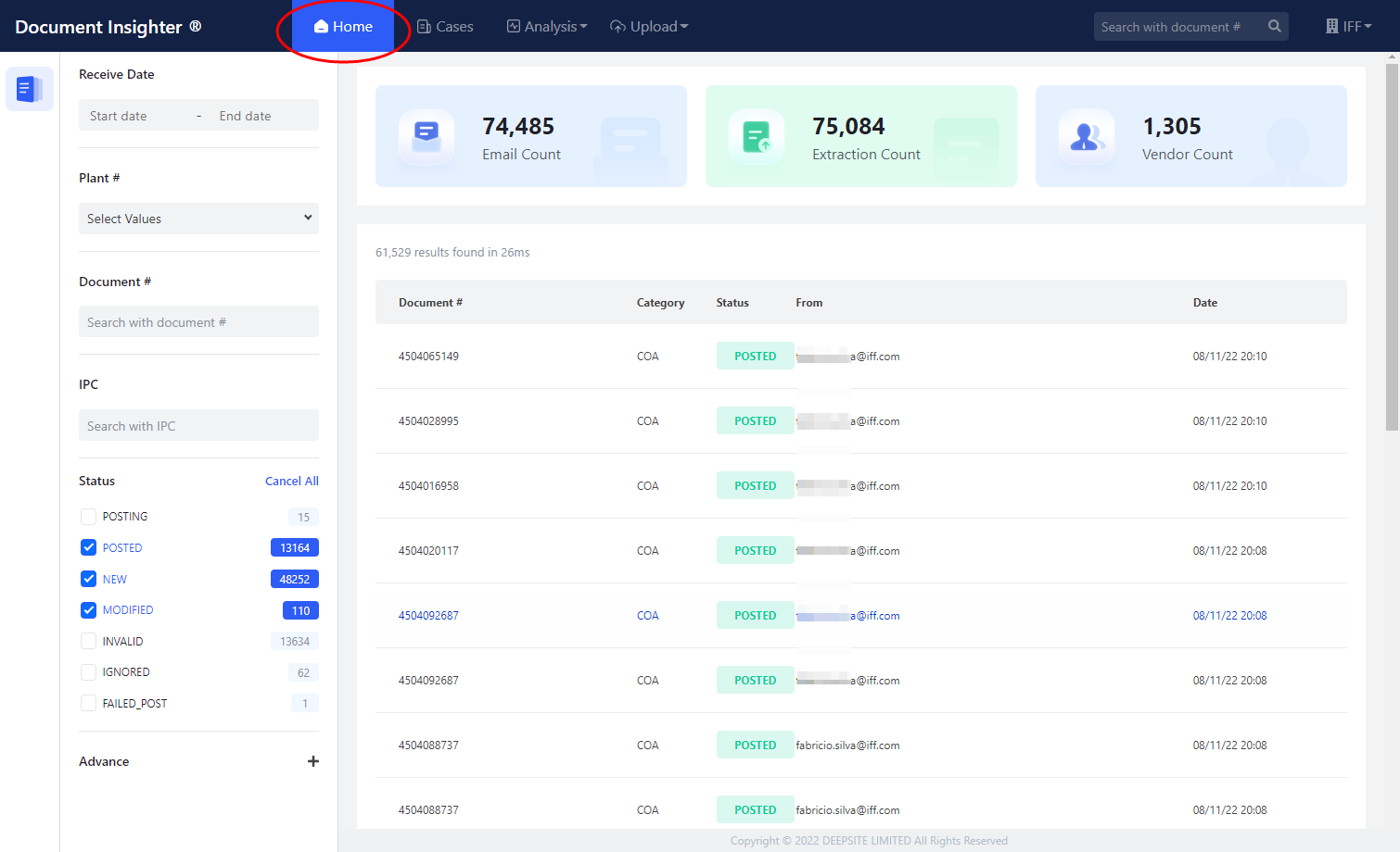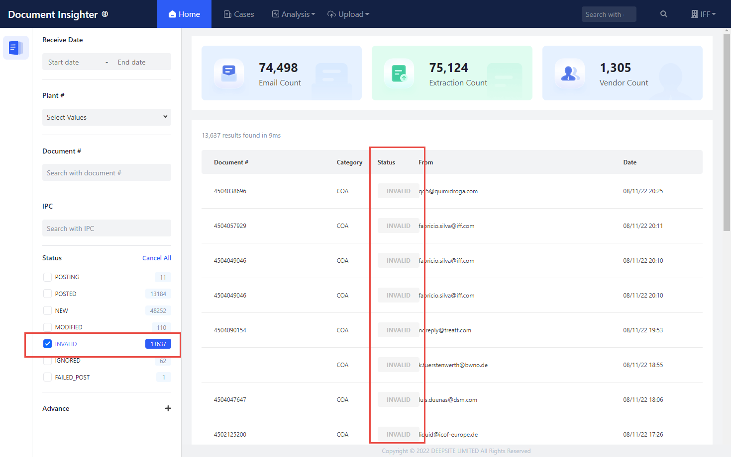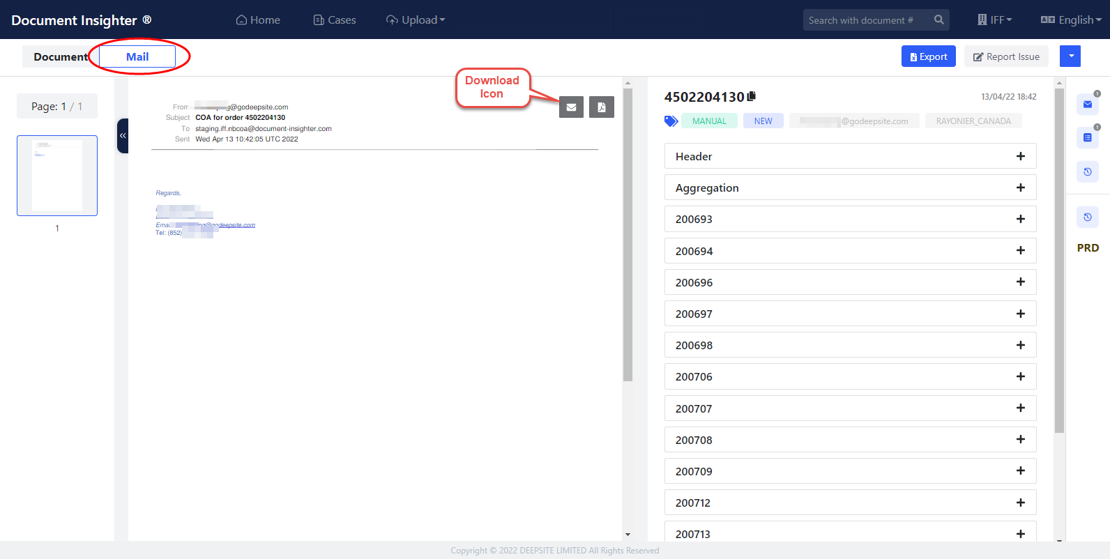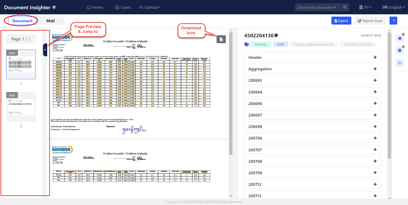 After the system enhancement and upgrating, Document Insighter supports users email or upload COA documents with multiple batches/IPCs/orders/PDF files in a mail now. The system will divide the extraction results from the same email but different orders into different extractions and presented separately on the portal.