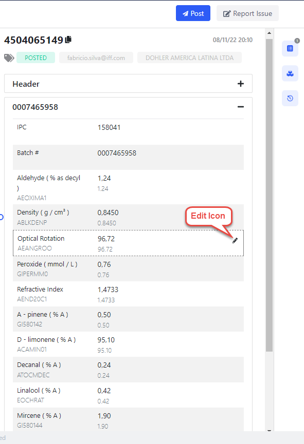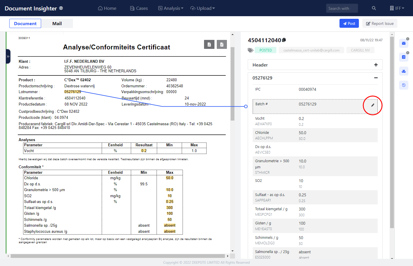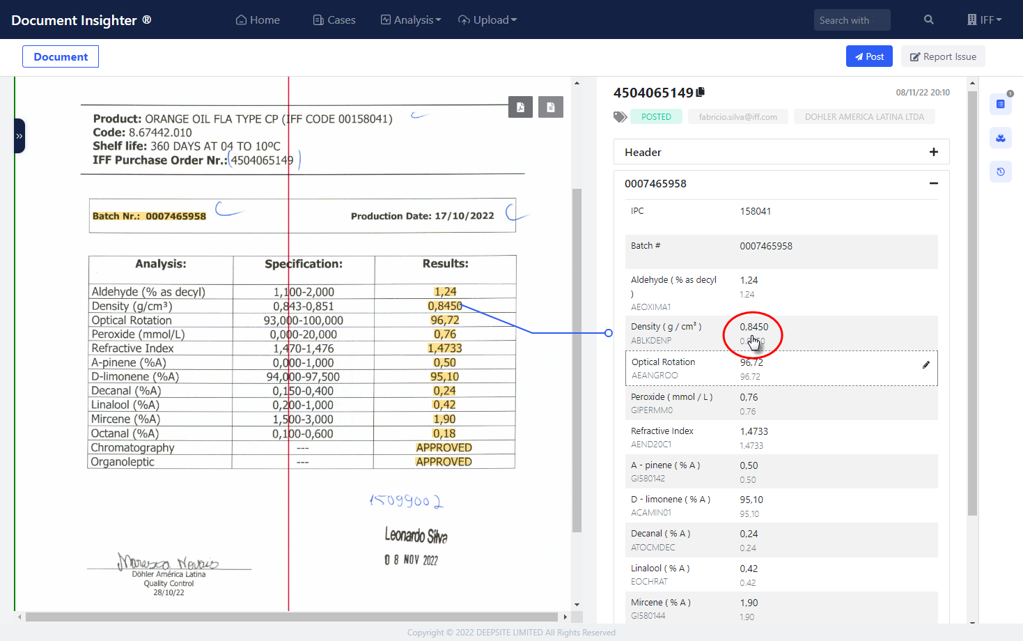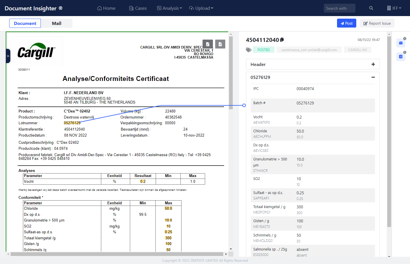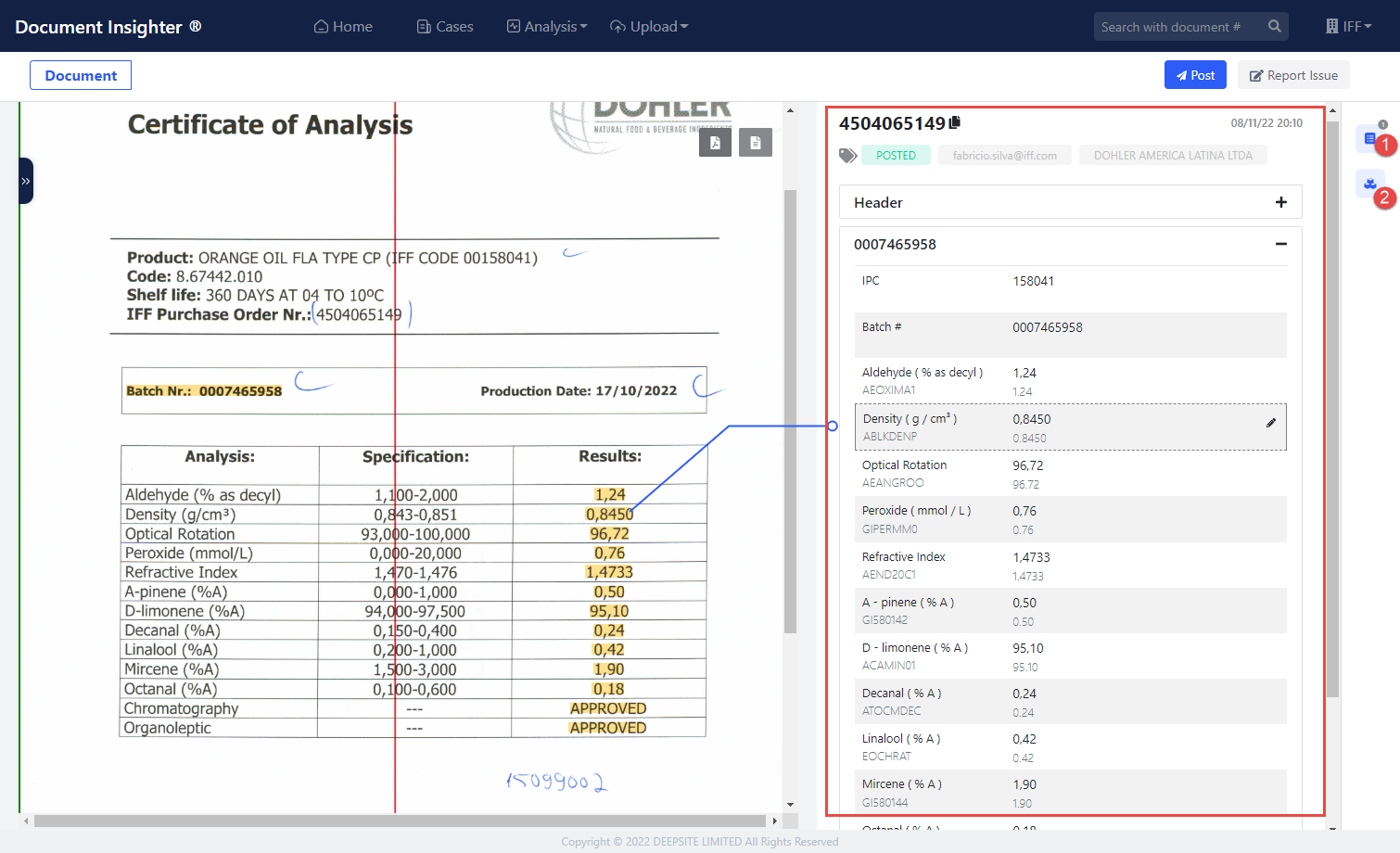 The contents in the following picture with the red box show the extracted test parameters in vendor’s COA document. Our ontology engine will map it to the IFF MIC SpecCode automatically.