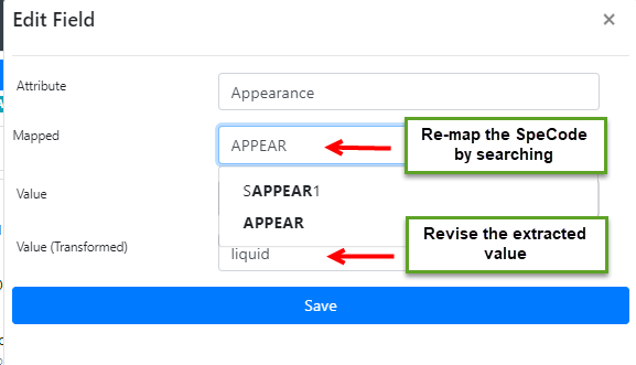 User can change the default mapped code to others if it is not correct or just leave it blank if it is not the critical one, also can revise the test value extracted.