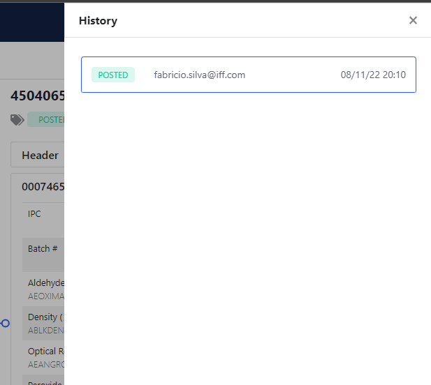 The extracted data will be shown in the right side of the page including Test parameter results and mapped Spec codes. Clicking the button ① in the following picture will display the historical extracted records of the COA: