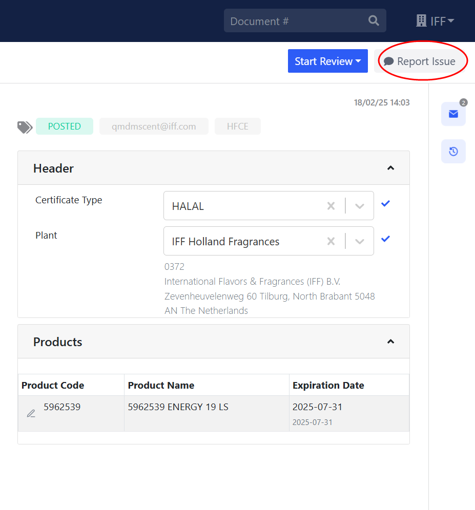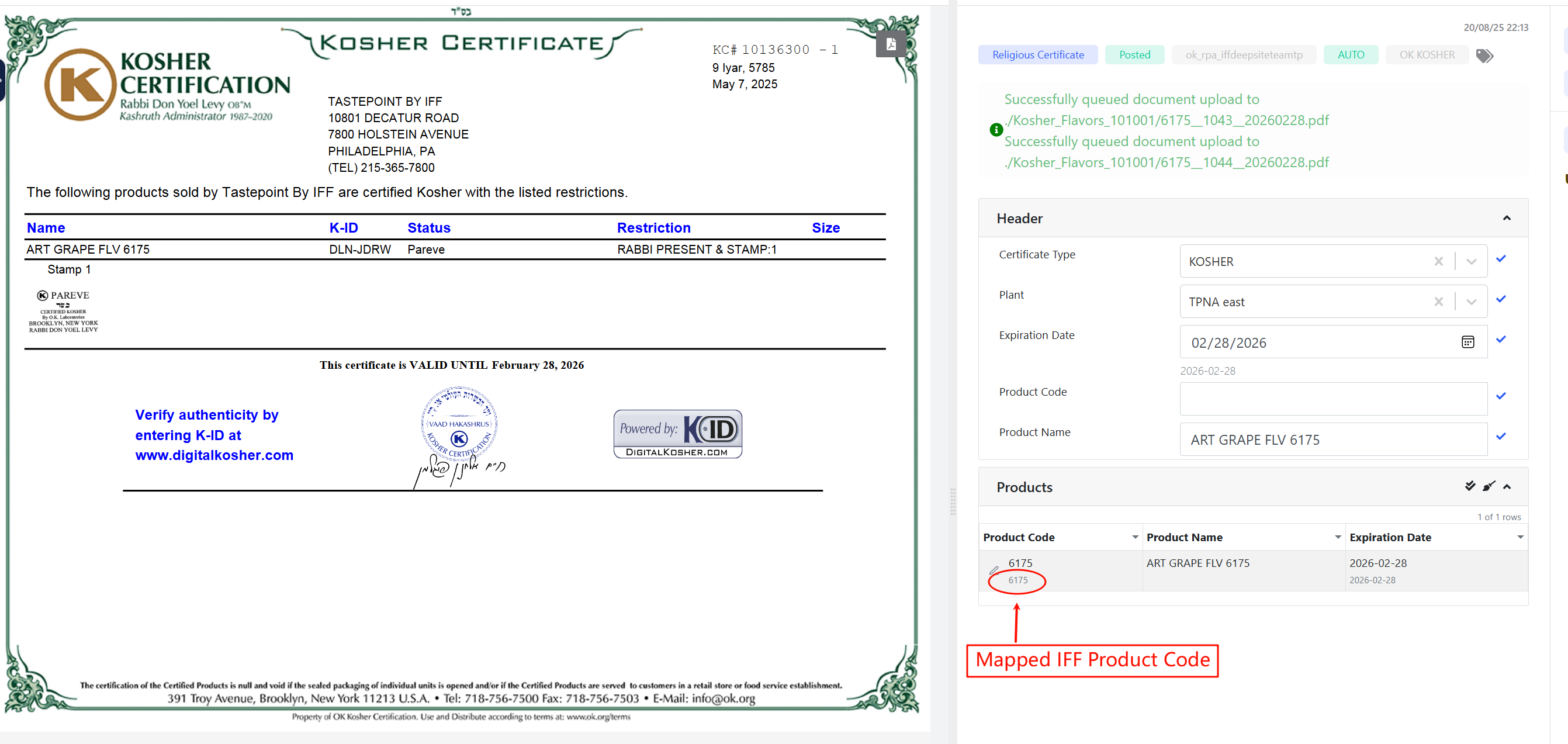 Contains general certificate information: - Certificate Type: Shows the detected certificate type (HALAL or KOSHER) - Plant: Shows the extracted plant address and the auto mapped IFF plant code by the system