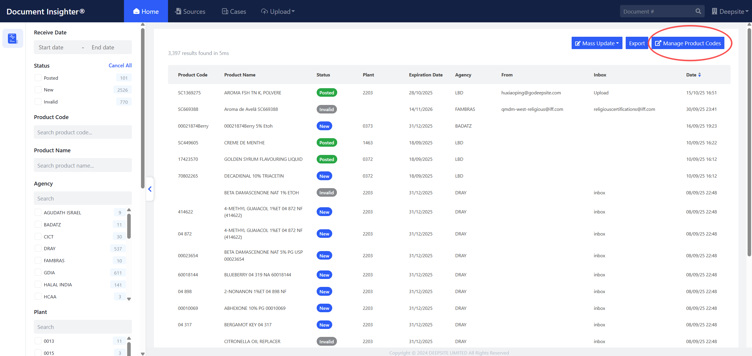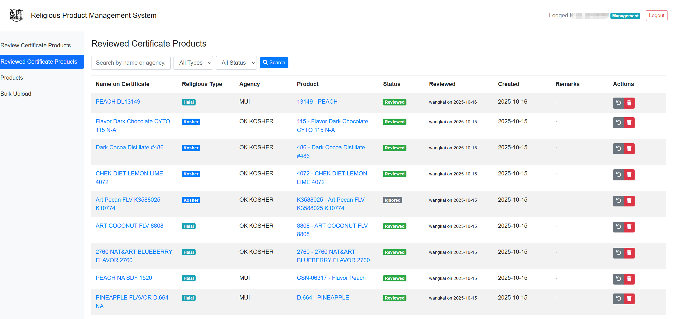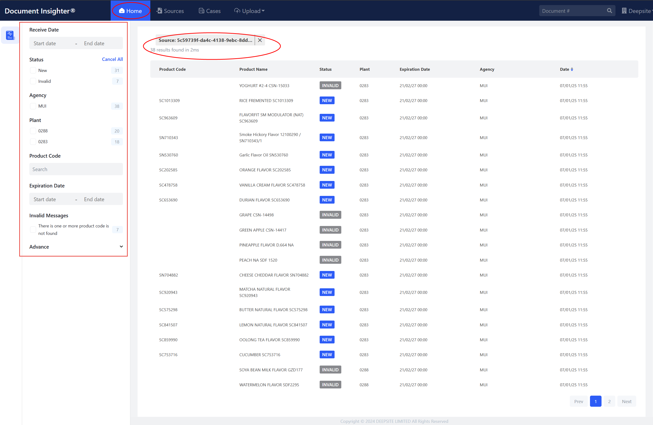 The Homepage displays all extracted products information from religious certification documents at a product level. After the system processes documents from Sources page, it breaks down multi-page certificates into individual product entries for easier management and validation. Users can access this page either directly by clicking the “Home” button to view all processed products, or through the Sources page to view products from a specific source.