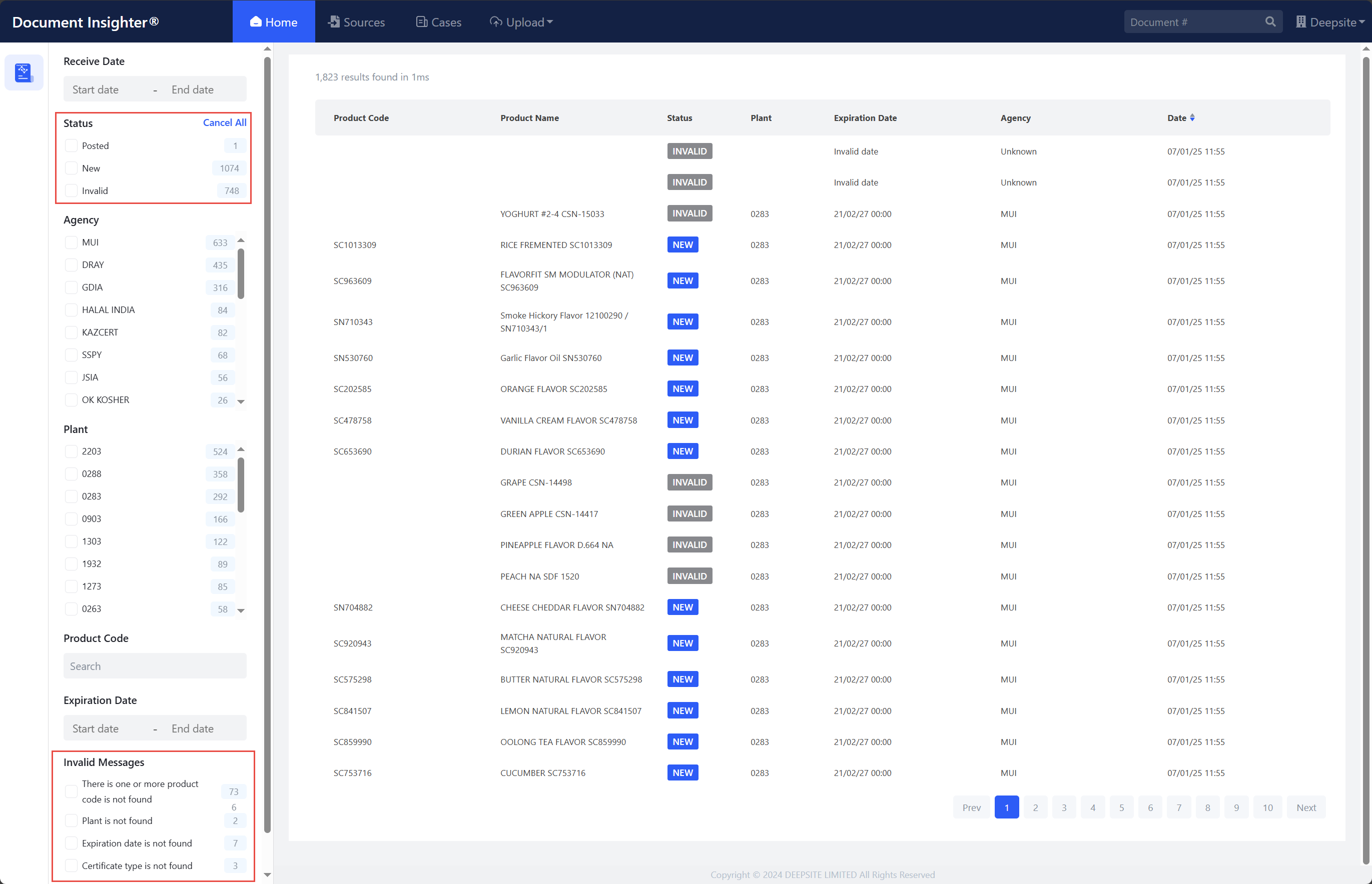 Users can efficiently manage invalid products by using the “Invalid Messages” filter to focus on specific issues: - Select “Product code is not found” to review and map missing product codes - Choose “Plant is not found” to correct facility information - Filter by “Expiration date is not found” to add missing dates - Select “Certificate type is not found” to specify certification types - Select “No products are found” to review if the case should be ignored