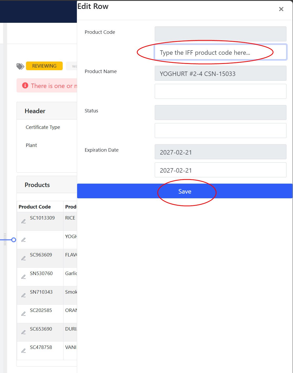 User can edit the exported xlsx file to perform bulk modifications. Type in the IFF product code in the “Product Code” column to update the Status to “REVIEWED”.