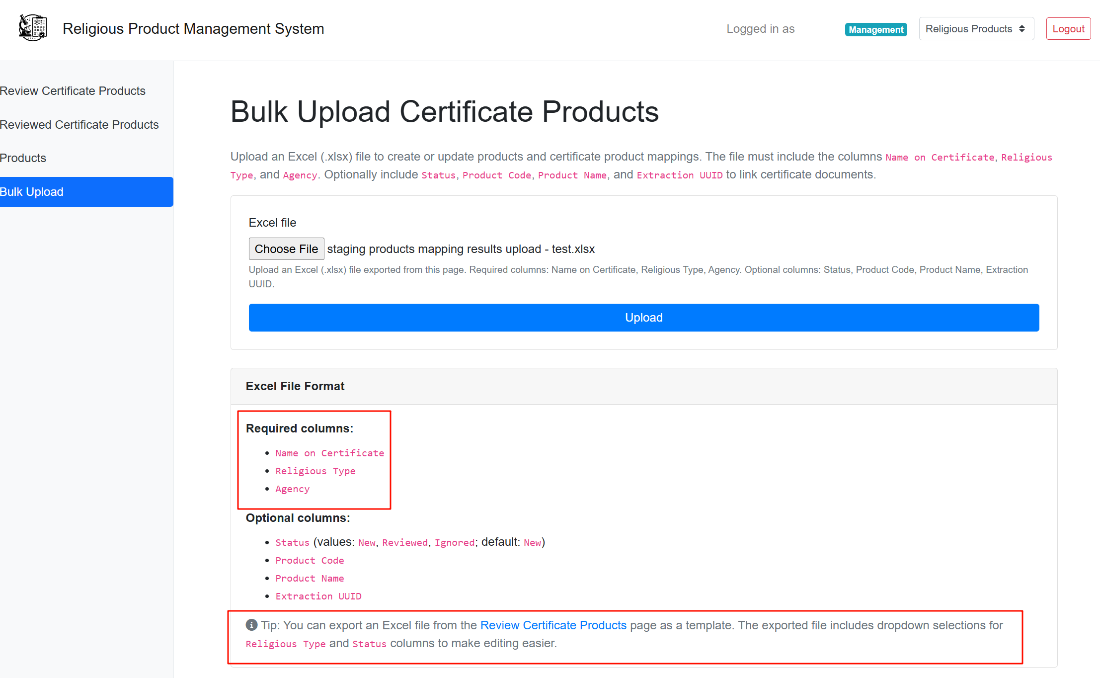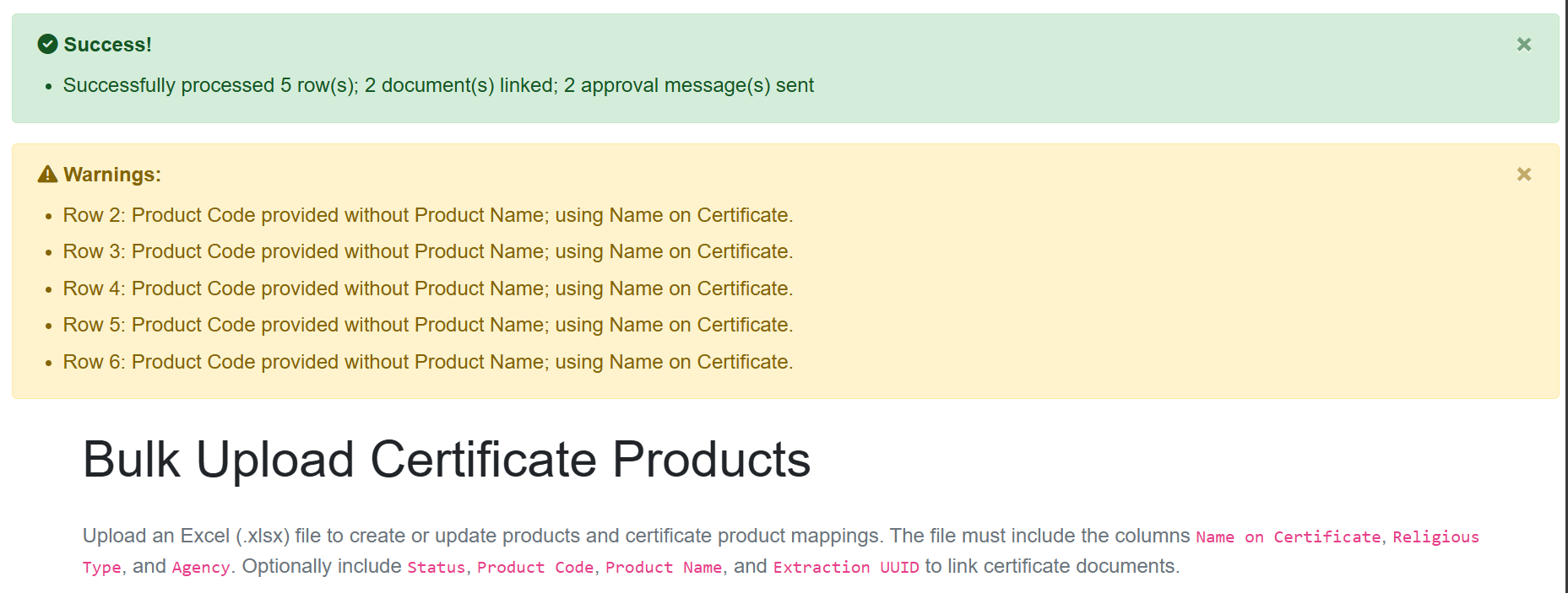 The Bulk Upload functionality allows batch import of product codes and certificate products through Excel files.