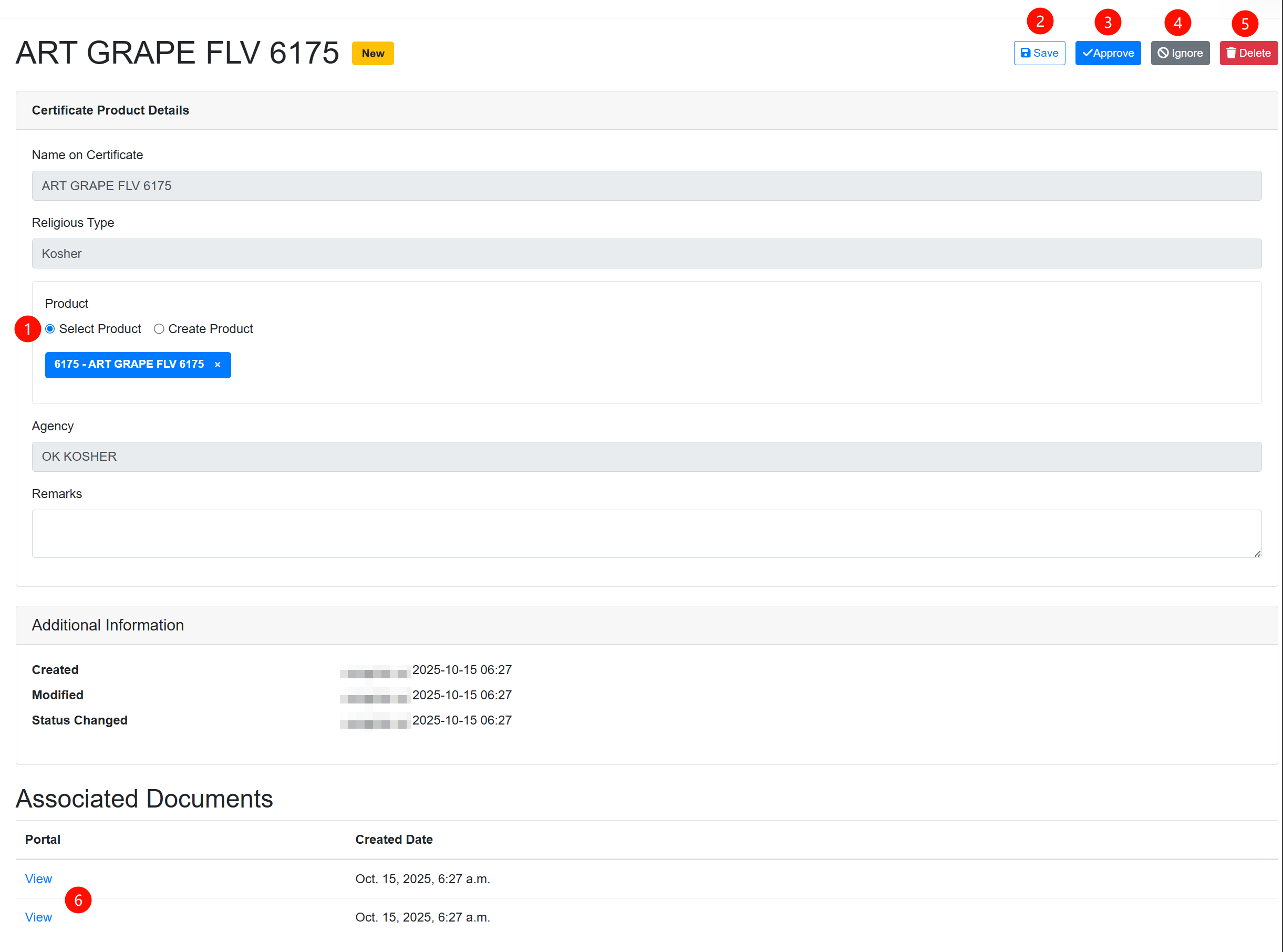 Ignore ④: Mark this certificate product as ignored and change its status to “Ignored”. This action is used when a product is not relevant or should be excluded from further processing. Ignored products can be viewed in the “Reviewed Certificate Products” section.