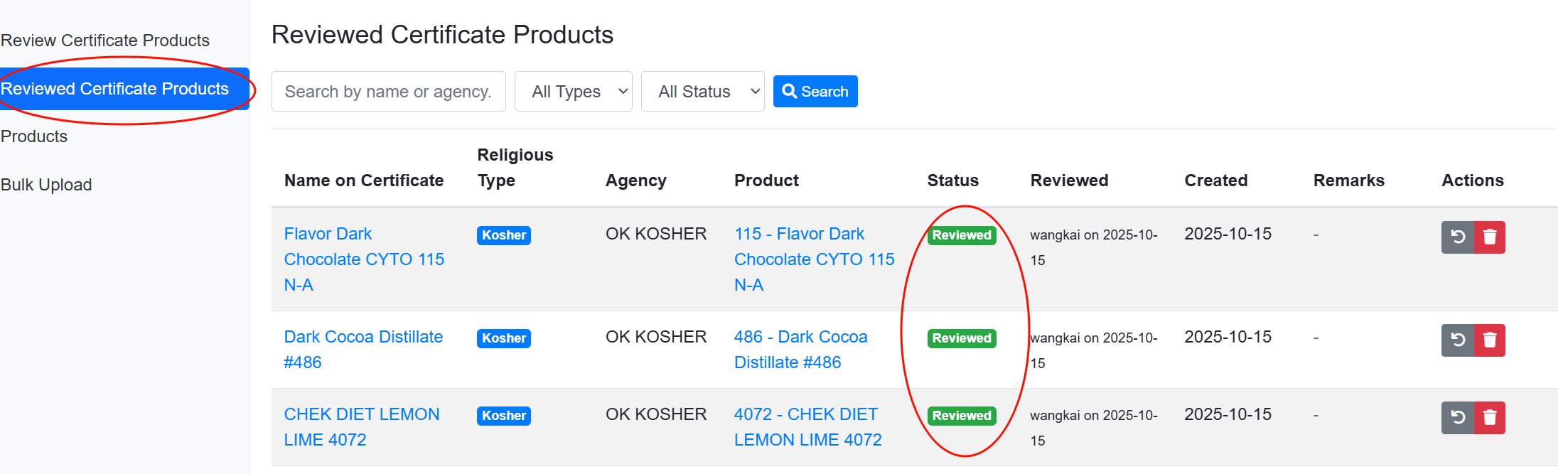 Approve ③: Approve this certificate product and change its status to “Reviewed”. The product will be moved to the “Reviewed Certificate Products” section for final management.